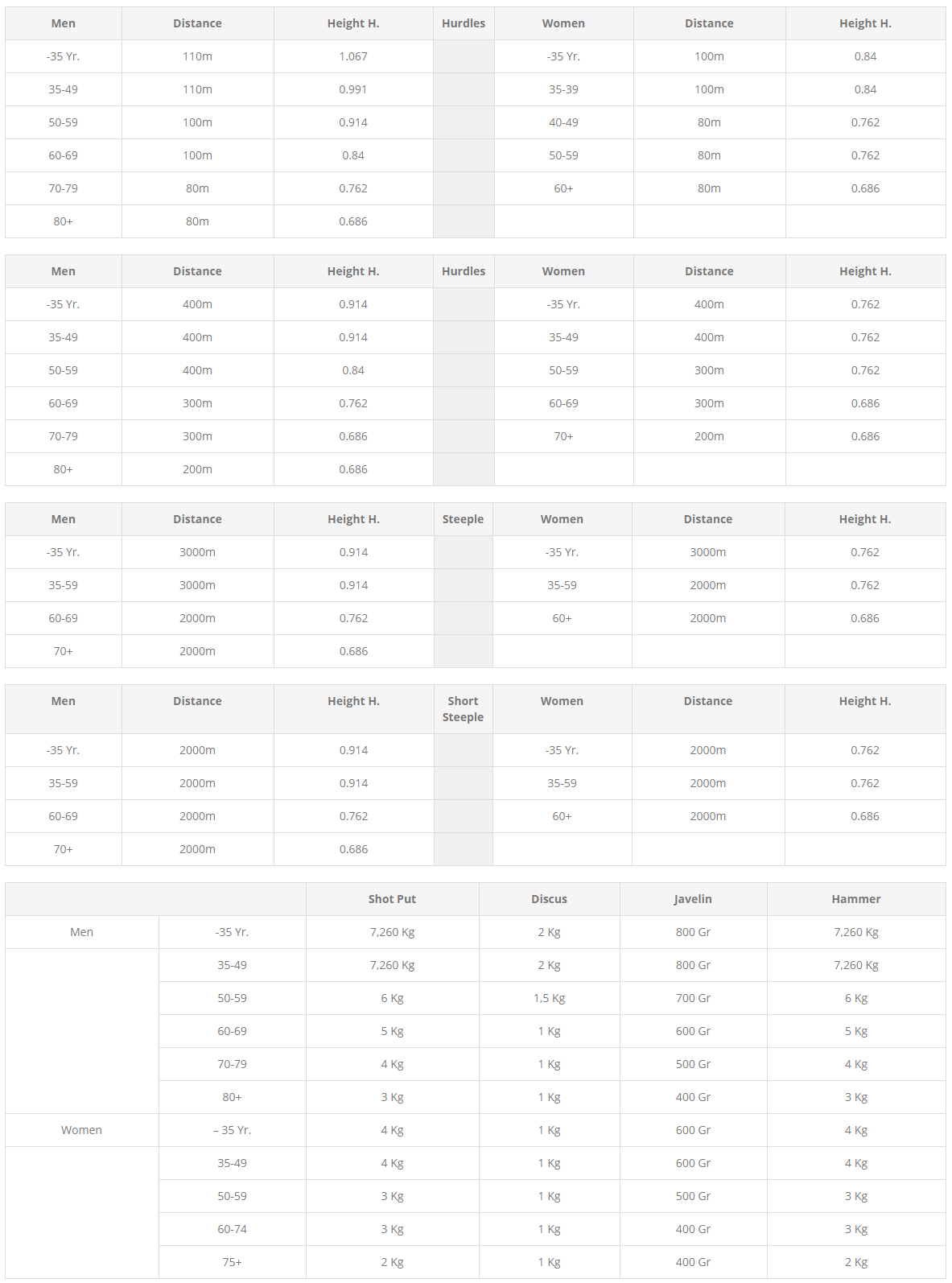 The Hurdles and Steeplechase events are configured for the following distances and obstacle heights, which have been included in regulations since 2008. The results will only be correct if these values are used on the course.